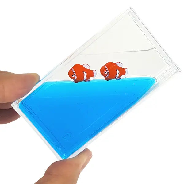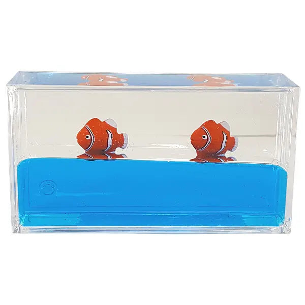 • Hard acrylic case holds a water and oil liquids and contains two Clown Fish figures that when tilted side to side will affect the liquid and Clown Fish inside. This a great and affordable visual toy that can be interactive as well. Add to your collection of fidget toys or place on a desk. Similar items can be discovered in our online store at The Fidget Toy Box.